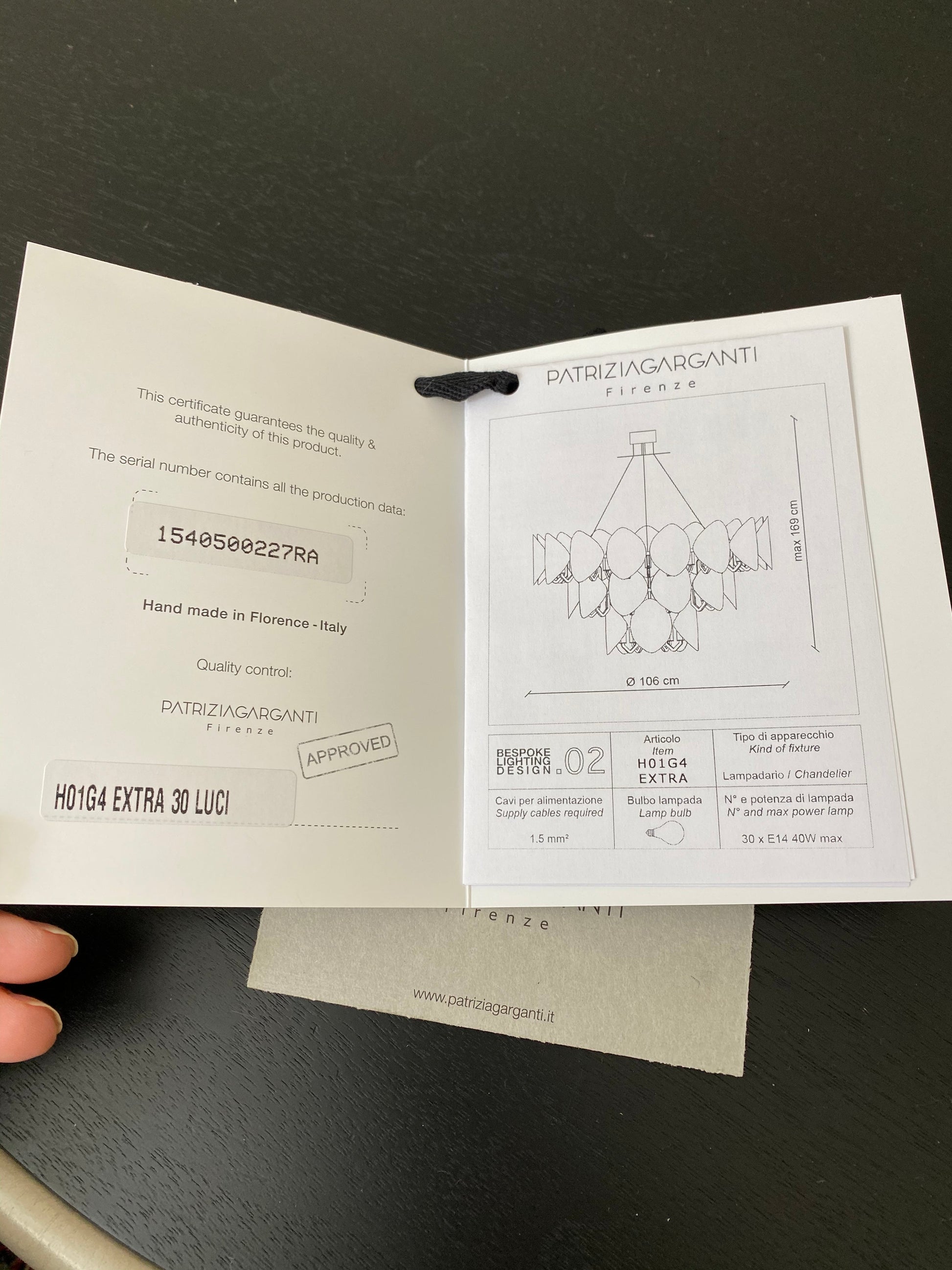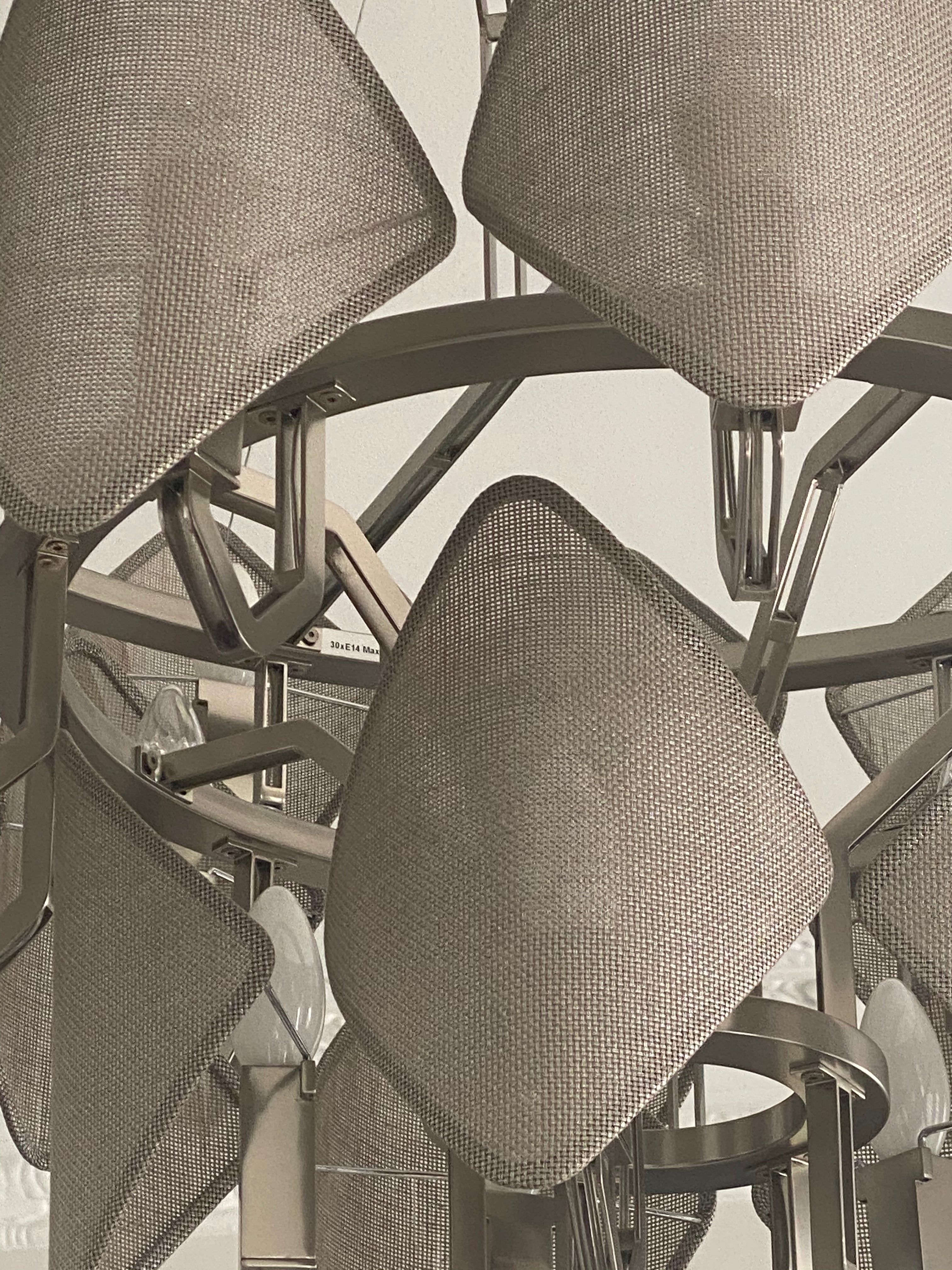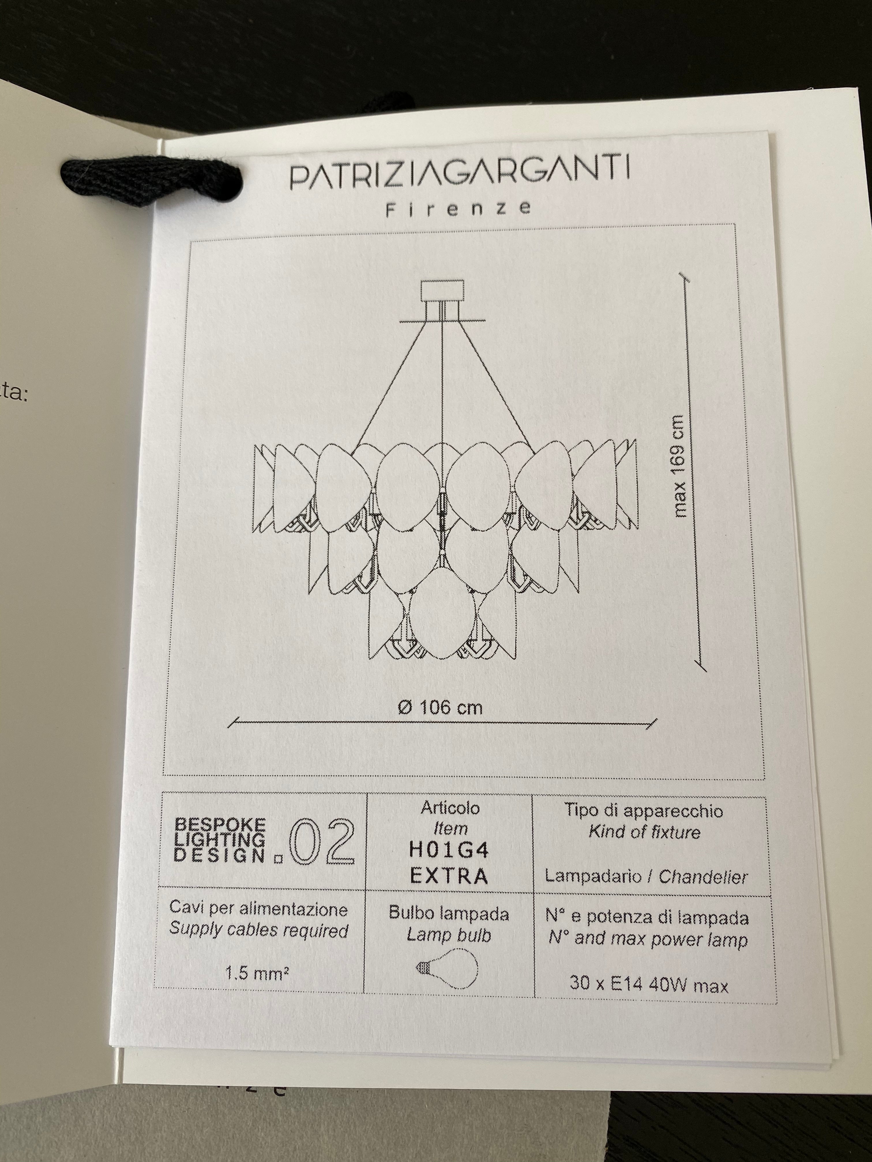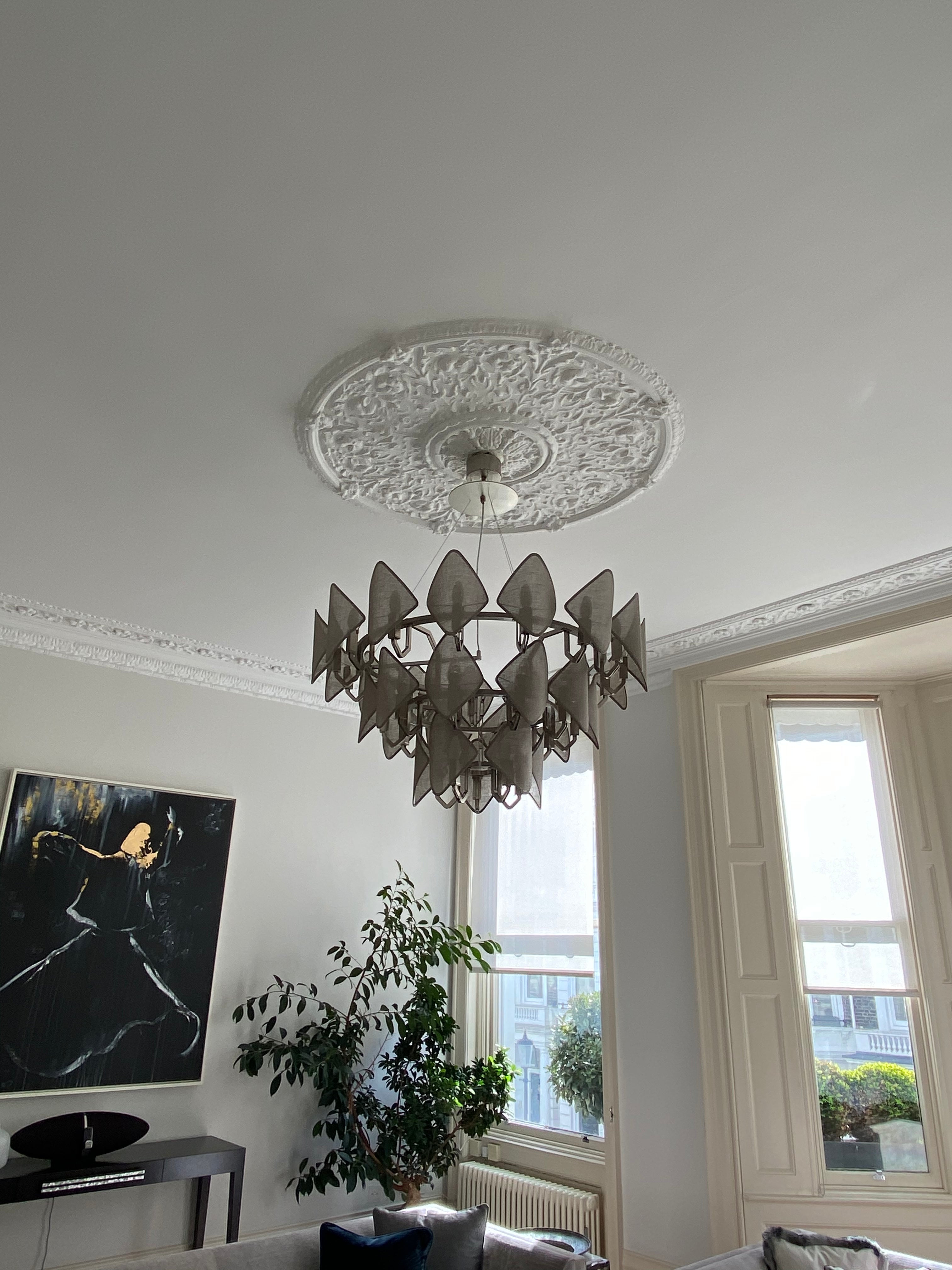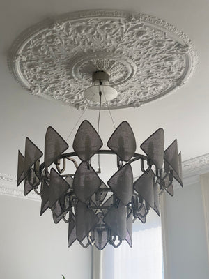 A Patrizia Garganti Holly Chandelier in silver grey, three tiers of delicate shades sit on the chrome frame.
