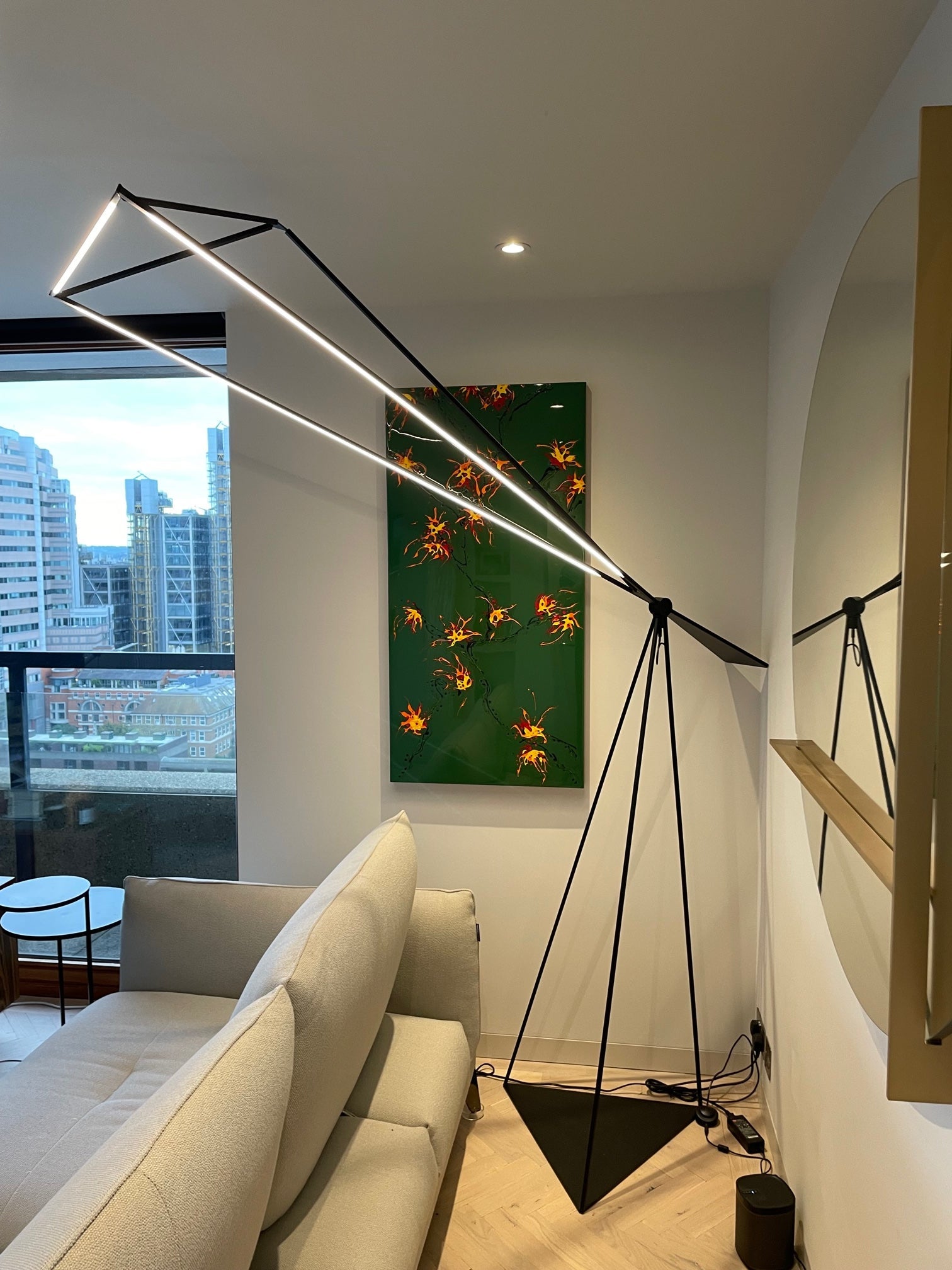 This large floor lamp is made from lacquered metal has LED lights and the base in lacquered steel.