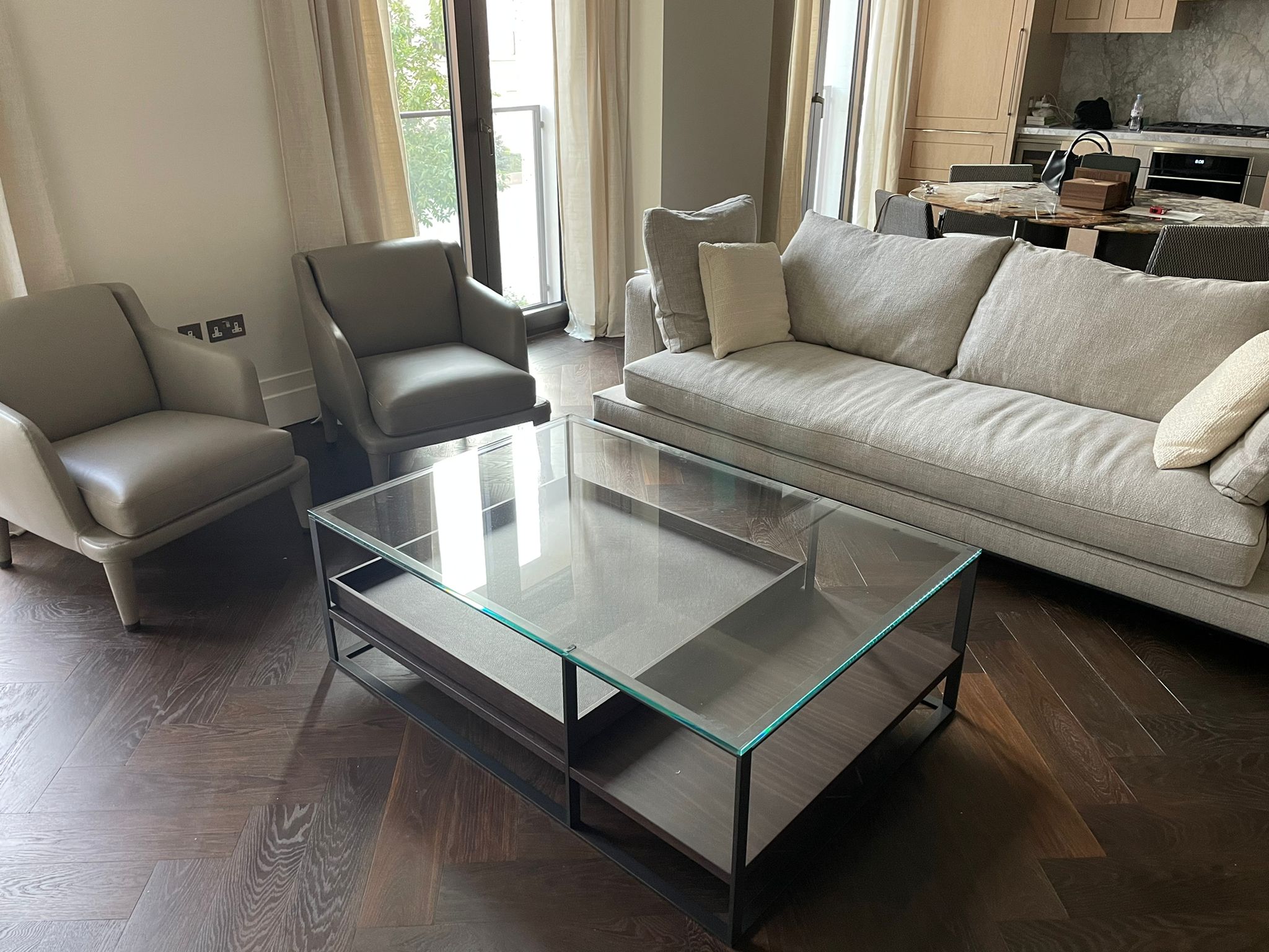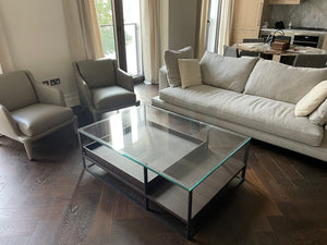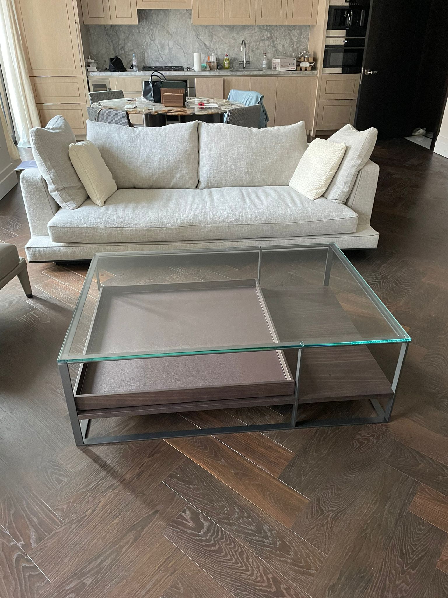 A Maxalto Lithos Coffee Table. Brand new - never used, with Alta 355 Chocolate leather trays, glass top and steel frame.