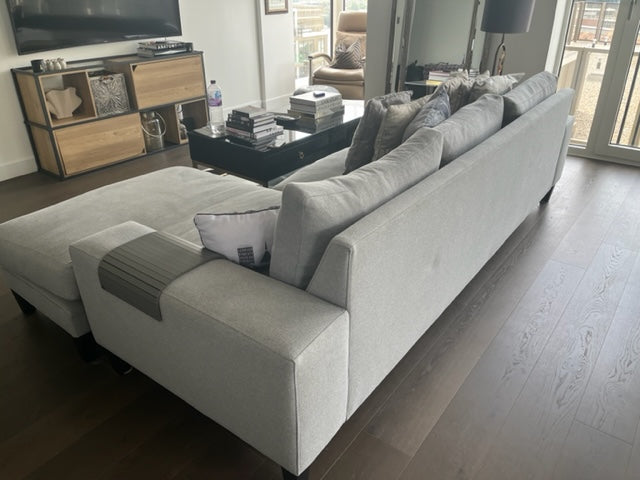 A simple, elegant design L-shaped sofa for 4 people from Raft. Finished in a smooth, durable grey fabric. Raft produces excellent quality furniture with attractive design.