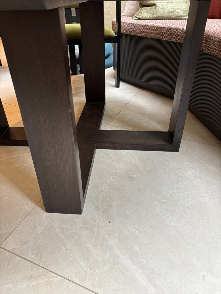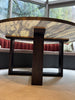 This truly stunning marble dining table is made of Calacatta marble with black wood base with beautiful detailed bronze border. The table is 160 cm diameter, 73 cm height and seats 8 people.
