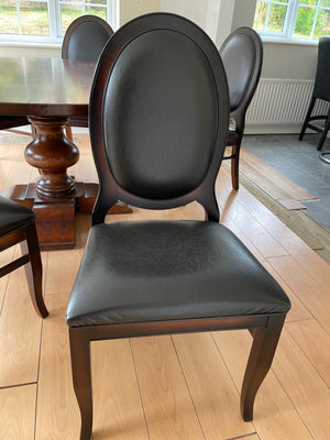 The juxtaposition of solid wood combined with a faux leather upholstered back and seat elevates your dining space with a touch of elegance. These chairs are fully padded for comfort, ideal for both sophisticated dinner events and casual dining occasions. The wood finish is lacquered for added protection and a subtle sheen while the faux leather used for the upholstery creates a sophisticated, clean elegance.