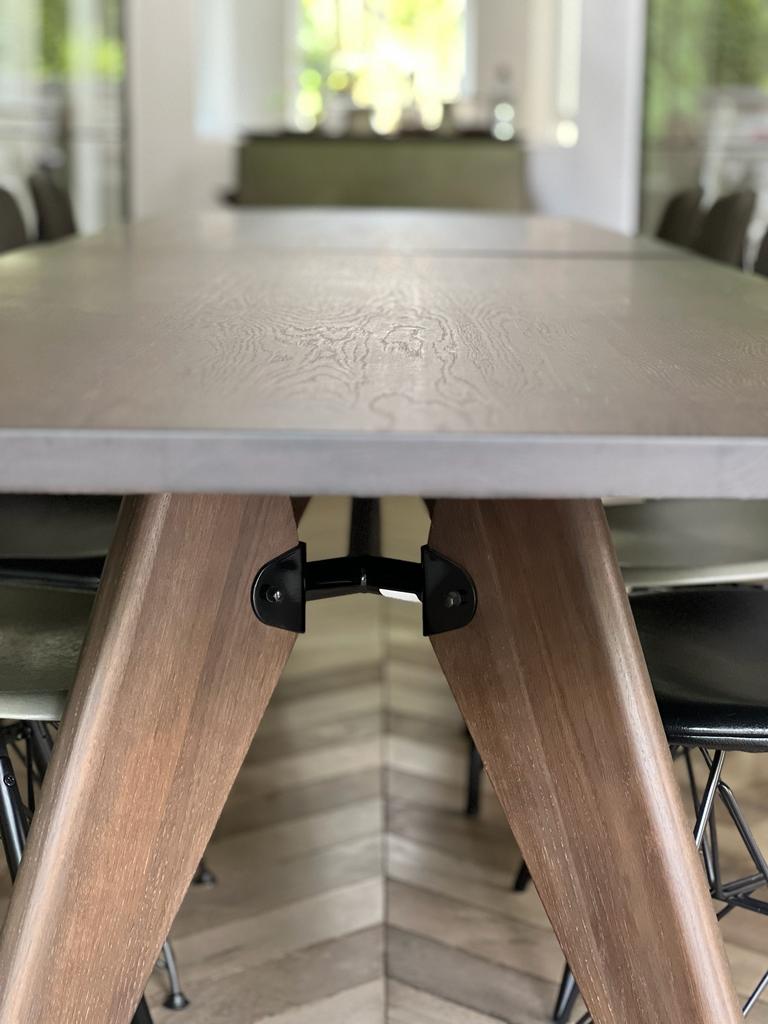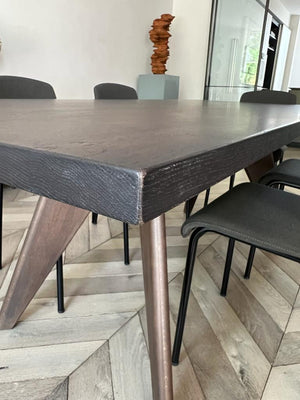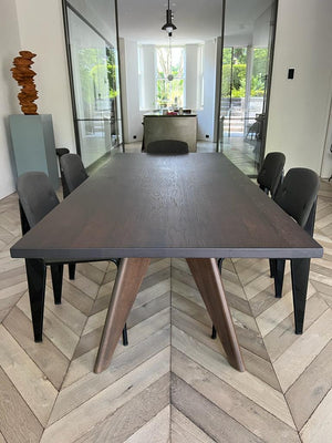 An iconic Vitra Table Solvay by Jean Prouvé, finished in Smoked Solid Oak, W200 xx D90 xx H74. The table can seat up to 8.